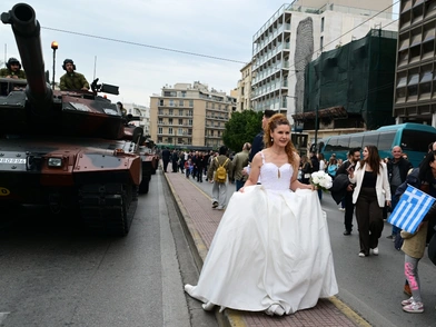Η νύφη φόρεσε το νυφικό της και βρέθηκε στη Λεωφόρο Αμαλίας λίγο πριν ξεκινήσει η μεγάλη στρατιωτική παρέλαση στο κέντρο της Αθήνας, κρατώντας μια ανθοδέσμη και ποζάροντας στον φωτογραφικό φακό.