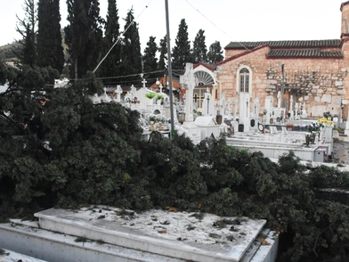 Στο Άργος, κυπαρίσσι ξεριζώθηκε από τον αέρα και έπεσε πάνω σε μνήμα στο νεκροταφείο της πόλης.