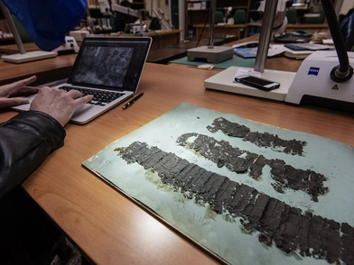 Για να αποφύγουν την περαιτέρω καταστροφή των χειρογράφων, ο καθηγητής Σιλς και η ομάδα του χρησιμοποίησαν έναν επιταχυντή σωματιδίων, για να κάνουν μια ––-εξαιρετικά υψηλής ανάλυσης- σάρωση του εσωτερικού των τυλιγμένων παπύρων.
