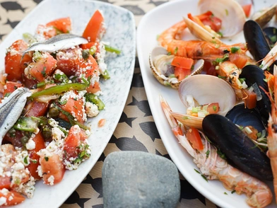 Η μεγάλη ποικιλία στον κατάλογο θα ικανοποιήσει τόσο εκείνους που θέλουν να συνοδεύσουν το ούζο, το τσίπουρο ή το κρασί τους με εκλεκτούς μεζέδες, όσο και τους πιο... πεινασμένους, που έχουν αδυναμία στα ολόφρεσκα ψάρια και τα οστρακοειδή. Οι γευστικές προτάσεις περιλαμβάνουν δροσερές σαλάτες, όλους τους κλασικούς ψαρομεζέδες, ολόφρεσκα μαλάκια, αλμυρές μπουκιές με καπνιστά ψάρια, μακαρονάδες θαλασσινών, παέγια και φυσικά φρέσκα μεγάλα και μικρά ψάρια, καλαμάρια, χταπόδια και σουπιές.