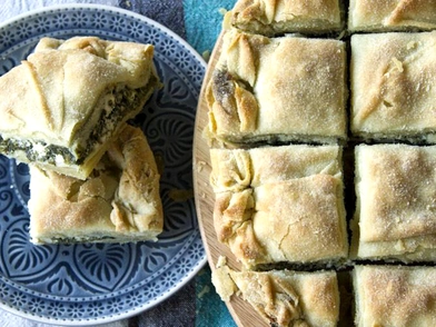Απλώνουμε καλά σε όλη την επιφάνεια του ταψιού. Πασπαλίζουμε με ελαιόλαδο τη γέμιση. Συνεχίζουμε την ίδια διαδικασία με πριν για ακόμα 2 φύλλα, βάζοντας τα πάνω από τη γέμιση καλύπτοντας το σπανάκι. Δίνουμε μεγάλη προσοχή στο τελευταίο φύλλο που το έχουμε αφήσει ολόκληρο. Το βάζουμε από πάνω και γυρνάμε τις άκρες προς τα μέσα με τα χέρια μας. Χαράζουμε την πίτα μας με ένα μαχαίρι. Ρίχνουμε το υπόλοιπο λάδι και έτοιμη να τη ψήσουμε. Ψήνουμε για 45-60 λεπτά ή μέχρι να γίνει τραγανή και πάρει χρώμα. Κόβουμε σε κομμάτια και πασπαλίζουμε με ελαιόλαδο.