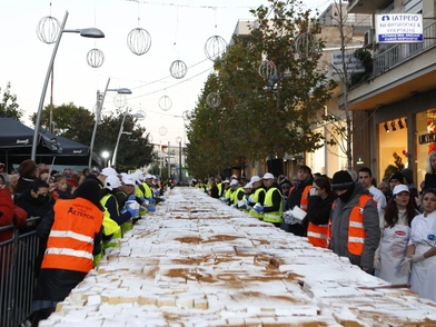 Εντυπωσίασε και φέτος η βασιλόπιτα - γίγας που παρασκευάστηκε από δεκάδες βιοτεχνικά αρτοποιεία και παρουσιάστηκε στην πλατεία Δημαρχείου στο Περιστέρι, όπου και μοιράστηκαν πάνω από 50.000 κομμάτια στους πολίτες.