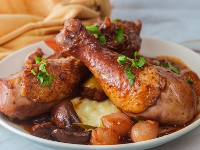 Η συνταγή πρόκειται για την ελληνική παραλλαγή του διάσημου γαλλικού κόκορα κρασάτου και παρασκευάζεται με κόκορα, ελληνικό κόκκινο κρασί, κρεμμύδια, σκόρδο, ελληνικό ελαιόλαδο και διάφορα μπαχαρικά.