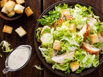 Αν θέλετε μια απλή και νόστιμη συνταγή για σαλάτα του Καίσαρα που μπορείτε να απολαύσετε ως ένα κυρίως γεύμα, σας παραθέτουμε παρακάτω μία από τις πιο δημοφιλείς συνταγές της Αμερικανίδας σεφ και συγγραφέα βιβλίων μαγειρικής Julia Turshen. Η συγκεκριμένη συνταγή για ντρέσινγκ σαλάτας Caesar, που περιλαμβάνεται στο βιβλίο της σεφ «Small Victories», χρησιμοποιεί μαγιονέζα αντί για ωμό αυγό που περιέχει η κλασική συνταγή. Εσείς μπορείτε να προσθέσετε ψητό κοτόπουλο και ξεροψημένα κρουτόν για να γίνει από μόνη της ένα χορταστικό πιάτο.