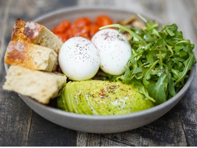 Λιωμένο αβοκάντο, τοματίνια, ρόκα, μανιτάρια και ζυμωτό ψωμί (προαιρετική προσθήκη αυγών).