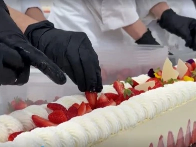 Περίπου 350 κιλά φράουλες, 150 κιλά ζάχαρη, 415 κιλά κρέμα πατισερί και 4.000 αυγά: ένα ζαχαροπλαστείο στο Argenteuil (Val-d’Oise), στη Γαλλία, κατέρριψε το ρεκόρ για τη μεγαλύτερη τούρτα φράουλας στον κόσμο, με μια τούρτα πιστοποιημένου μήκους 121,88 μέτρων.