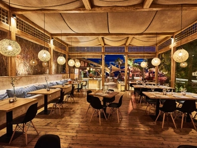 Το ξύλο παίζει κυρίαρχο ρόλο στην εικόνα. Από το πάτωμα μέχρι τα τραπέζια και την εντυπωσιακή οροφή, οι ξύλινες λεπτομέρειες δημιουργούν μία πολύ «ζεστή», cozy διάθεση. Σε αυτό συμβάλλουν και οι γήινες αποχρώσεις στον φωτισμό και στον περιβάλλοντα χώρο, με το πράσινο των πλούσιων φυτών να δίνει τη δική του εξωτική πινελιά.