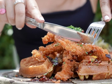 Waffle με τραγανό φιλέτο κοτόπουλου παναρισμένο με δημητριακά, crispy bacon και maple syrup. Αυτό το πιάτο παίρνει μάλλον το χρυσό μετάλλιο για την πιο ιδιαίτερη και παράλληλα mainstream επιλογή που μπορείς να κάνεις.