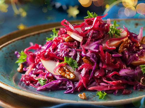 Μία υπέροχη γεμάτη χρώματα και γεύση σαλάτα μπορεί να γίνει η πρωταγωνίστρια στο χριστουγεννιάτικο τραπέζι σας. Η συνταγή είναι απλή και καλύπτει έξι άτομα.