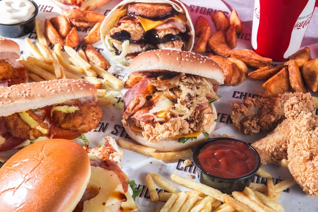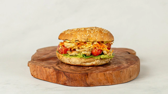 Τα υλικά: Κρουσταριστό φιλέτο κοτόπουλο, μοσχαρίσιο μπιφτέκι 250gr, διπλό cheddar, διπλό καπνιστό μπέικον, λαχταριστό τηγανητό αυγό, iceberg, ντομάτα, σως καπνιστής μαγιονέζας & sweet τσίλι σως