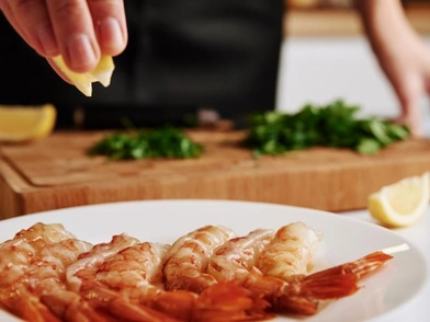 Πλένουμε, καθαρίζουμε τις γαρίδες και αφαιρούμε από τη ράχη το εντεράκι τους.