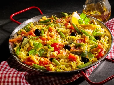 Η ονομασία της προέρχεται από το ειδικό σκεύος στο οποίο μαγειρεύεται, την παεγιέρα (paellera), ένα πλατύ στρογγυλό τηγάνι με δύο χερούλια. Παραδοσιακά η παέγια μαγειρεύεται στο ύπαιθρο σε φωτιά από ξύλα και τρώγεται από το τηγάνι.