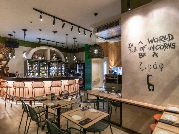 Ζιράφ ή αλλιώς η «καμηλοπάρδαλη των Εξαρχείων που ξέρει από καλό κρασί». Αλήθεια, όμως, γιατί «Ζιράφ»; Τι στο καλό γυρεύει το κατά τα άλλα αγαπημένο ζώο της Αφρικής με τον μακρύ λαιμό στο κέντρο της Αθήνας; Αυτή την απάντηση ζητήσαμε να μας τη δώσει ο εκ των ιδιοκτητών του μαγαζιού και καταξιωμένος sommelier, Βασίλης Παπαδόπουλος, ο οποίος όπως μας εξήγησε ήθελε να δημιουργήσει μαζί με τους καλούς του φίλους, William Δράκο και Γιάννη Τερψίδη, έναν ιδιαίτερο χώρο για να υποδέχονται φίλους και λάτρεις του κρασιού.