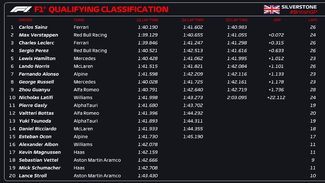Το Q3 άρχισε με την ένταση της βροχής να έχει υποχωρήσει. Ο Φερστάπεν έκανε τετ-α-κε στην πρώτη του προσπάθεια, όμως στη συνέχεια σημείωσε τον καλύτερο χρόνο. Οι χρόνοι βελτιώνονταν αισθητά μέχρι να μηδενιστεί το χρονόμετρο και τελικά ήταν ο Σάινθ αυτός που πήρε την pole position. Δίπλα του στο grid του αυριανού αγώνα (εκκίνηση στις 5 μ.μ. ώρα Ελλάδας) θα είναι ο Φερστάπεν, με τους Λεκλέρ και Πέρεζ να εκκινούν από τη δεύτερη σειρά.