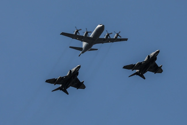 Πάνω από το χώρο της παρελάσεως διήλθαν σε σχηματισμούς αεροσκάφη και ελικόπτερα όλων των τύπων των τριών κλάδων των Ενόπλων Δυνάμεων και των Σωμάτων Ασφαλείας.
