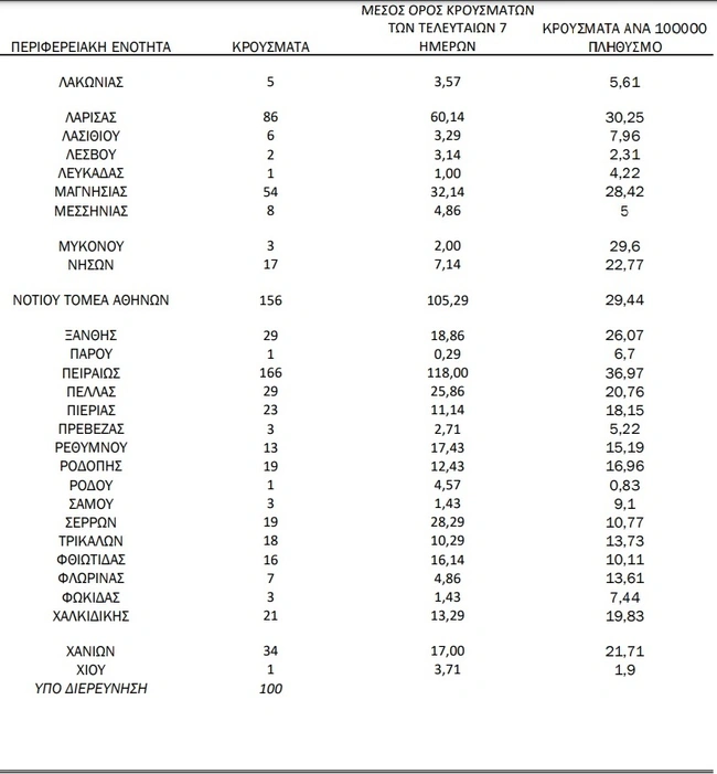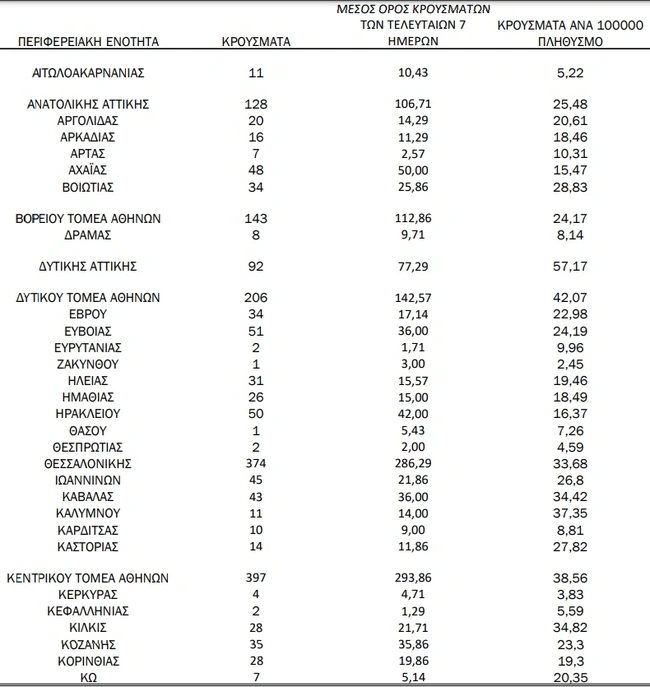 Αναλυτικά τα κρούσματα σε όλη την Ελλάδα