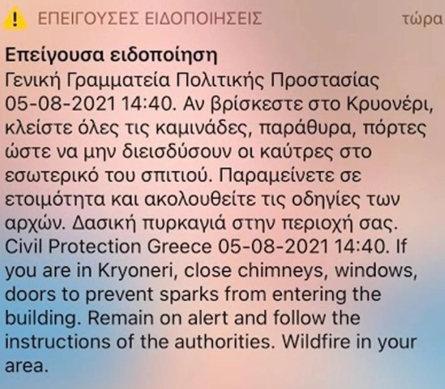 Νωρίτερα μήνυμα στο κινητό τους έλαβαν και όσοι βρίσκονται κοντά στην Ιπποκράτειο Πολιτεία. Σύμφωνα με το μήνυμα οι κάτοικοι από την Ιπποκράτειο Πολιτεία πρέπει να κατευθυνθούν προς εθνική οδό Αθηνών – Λαμίας και από Δροσοπηγή προς Αφίδνες και Ωρωπό.