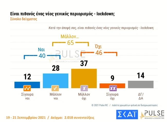Για το ενδεχόμενο νέου γενικού lockdown το 40% συνολικά εκτιμά ότι το σενάριο αυτό είναι βέβαιο (12%) ή μάλλον θα συμβεί (28%), ενώ το 46% συνολικά θεωρεί ότι μάλλον δε θα συμβεί κάτι τέτοιο (37%) ή σίγουρα δε θα συμβεί (9%). 14% των ερωτώμενων δηλώνει δεν ξέρω/δεν απαντώ.