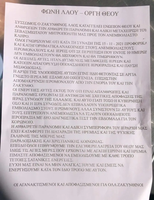 Υποστηρικτές των αρνητών ιερέων, πέταξαν στους δρόμους της πόλης της Ζακύνθου «τρικάκια» κατά του μητροπολίτη, κατηγορώντας τον για «απάνθρωπες και παράνομες ενέργειες». Υποστηρίζουν ότι η συμπεριφορά του ιεράρχη έχει διαταράξει την ψυχική γαλήνη του ποιμνίου, ενώ δεν διστάζουν μάλιστα να χαρακτηρίσουν τη σχετική απόφαση και τις ενέργειες της Μητρόπολης Ζακύνθου «σατανικές».