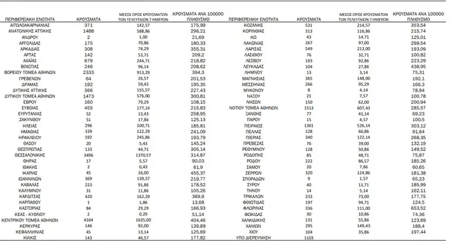 Τριψήφιο αριθμό κρουσμάτων έχουν οι εξής περιφερειακές ενότητες: Αχαία 679, Λάρισα 549, Κοζάνη 531, Εύβοια 455, Καρδίτσα 420, Αιτωλοακαρνανία 371, Ιωάννινα 369, Μαγνησία 365, Πιερία 340, Ημαθία 339, Φλώρινα 336, Σέρρες 320, Κόρινθος 313, Αρκαδία 308, Ηλεία 296, Λακωνία 267, Μεσσηνία 266, Βοιωτία 246, Τρίκαλα 233, Καβάλα 223, Ρόδος 222, Φθιώτιδα 197, Λέσβος 193, Δράμα 192, Αργολίδα 175, Εβρος 160, Κερκυρα 146, Κιλκίς 143, Αρτα 142, Θεσπρωτία 133, Χαλκιδική 131, Πέλλα 128, Λευκάδα 104, Χίος 104.