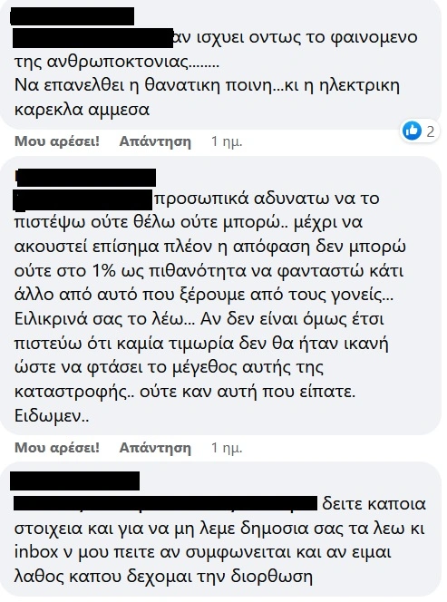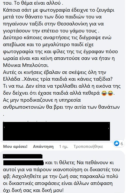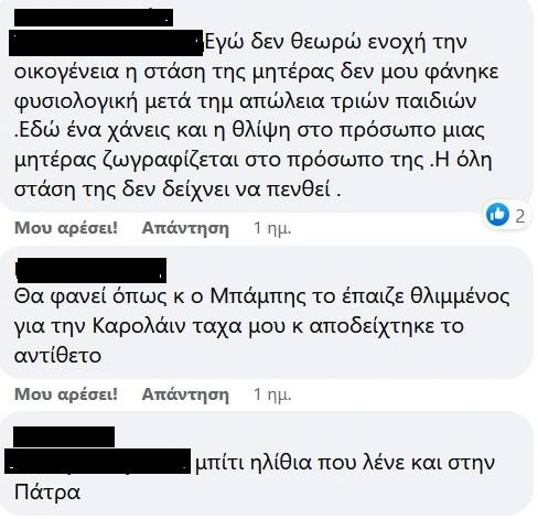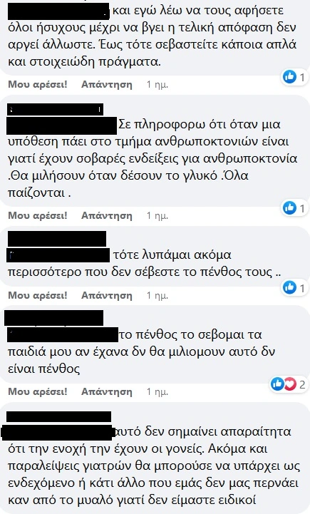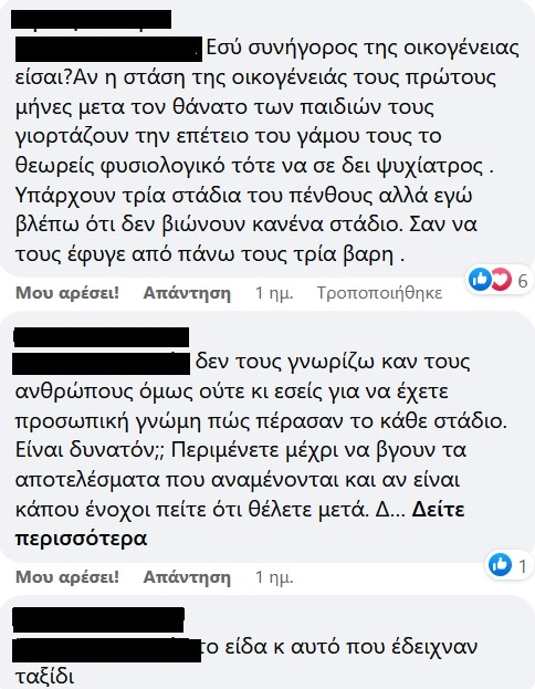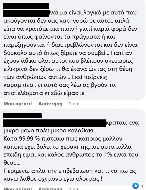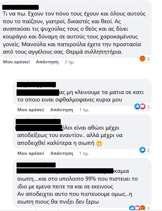 «Εχετε εσείς αίσθηση τέτοιου πόνου για να κρίνετε και να κτυπάτε σε αυτές τις στιγμές...?? Γυρολόγοι δικαστές αφήστε τους ανθρώπους στον πόνο τους να θρηνήσουν όπως θέλουν... επιτέλους !!! Ντροπή !!!». Με τον τρόπο αυτό επέλεξε να απαντήσει στον καταιγισμό μηνυμάτων καχυποψίας στην προσωπική σελίδα στο Facebook του πατέρα των 3 μικρών κοριτσιών, που έχασαν την ζωή τους μέσα σε τρία χρόνια στην Πάτρα, διαδικτυακός φίλος του Μάνου Δασκαλάκη.