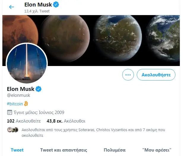 Ο Μασκ έγραψε απλά «#bitcoin» στη βιογραφία του στο μέσο κοινωνικής δικτύωσης. Στις 11:36 ώρα Ελλάδας, η τιμή του κρυπτονομίσματος διαμορφώθηκε στα 37.800 δολάρια.