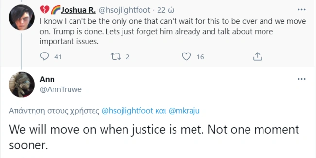 Παράλληλα, έχουμε την προσωρινή αναστολή των λογαριασμών του απερχόμενου προέδρου στο Twitter και το Facebook, αλλά και την απομάκρυνση του ονόματός του από κτήρια της Νέας Υόρκης και όχι μόνο.