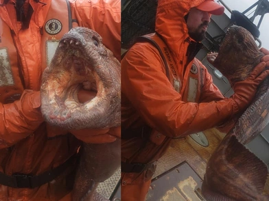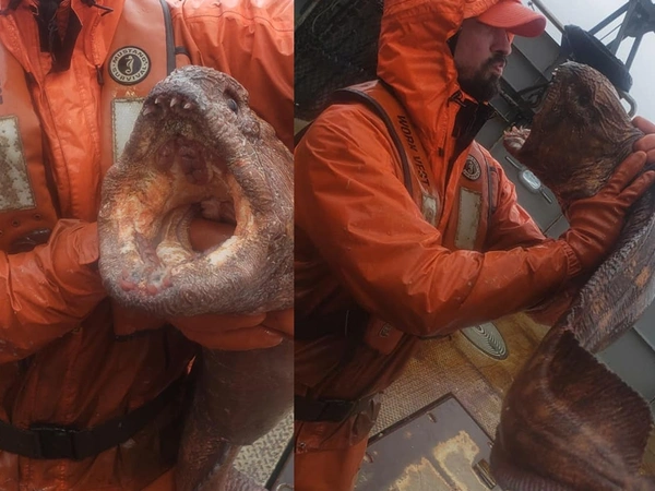 Ο Νέιτ Άιζακ έπιασε ένα τεράστιο «χέλι-λύκο» στις ακτές της Αλάσκας και προτού τον πετάξει πίσω στη θάλασσα... πόζαρε για μερικά κλικ με το... ασχημούλι ψάρι!