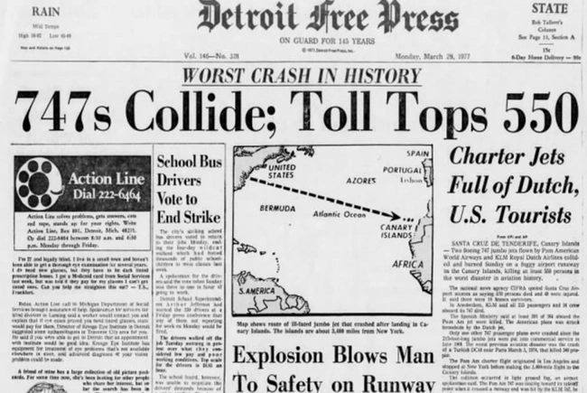Στις 27 Μαρτίου πίσω στο 1977 τα Κανάρια Νησιά έγινε το σκηνικό μιας ανείπωτης τραγωδίας. Όλα άρχισαν από μία βομβιστική ενέργεια στο αεροδρόμιο της Γκραν Κανάρια. Παρότι υπήρξαν μόνο κάποιοι τραυματισμοί, το αεροδρόμιο έπρεπε να κλείσει με αποτέλεσμα πολλές από τις πτήσεις που θα έπρεπε να προσγειωθούν εκεί, να ανακατευθυνθούν στο αεροδρόμιο Los Rodeos στην Τενερίφη, ένα άλλο από τα νησιά του συμπλέγματος.