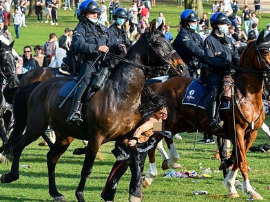 Οι εικόνες δείχνουν τη γυναίκα να προκαλεί την αστυνομία στο Bois de la Cambre και στη συνέχεια ένα άλογο να τη χτυπάει, να τη ρίχνει στο έδαφος κι εκείνη να κείτεται στο γρασίδι χτυπημένη. Δεν είναι ακόμη γνωστό ποια είναι η κατάστασή της.