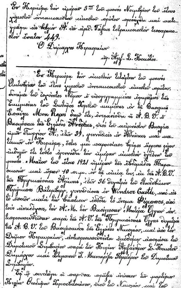 Πρόκειται για πιστοποιητικό που είναι γραμμένο στα ελληνικά, και μάλιστα στην καθαρεύουσα, από έναν ιερέα με το όνομα Σπυρίδων Τρύφωνας, και γράφει ότι ο πρίγκιππας ονομάστηκε κι επίσημα «Φίλιππος» κατά τη διάρκεια του βαπτίσματός του στην Ελληνική Ορθόδοξη Εκκλησία. Βρισκόταν σε δημοτικό αρχείο, κοντά στην Κερκυραϊκή βίλα που είχε γεννηθεί πριν από 100 χρόνια.