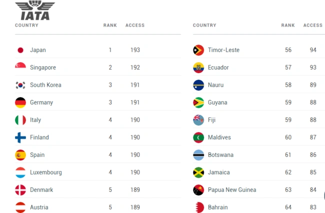 Η κατάταξη περιλαμβάνει 199 διαβατήρια. Η Ιαπωνία παραμένει στην πρώτη θέση. Οι κάτοχοι ιαπωνικού διαβατηρίου έχουν τη δυνατότητα να ταξιδέψουν σε 193 προορισμούς χωρίς Visa.