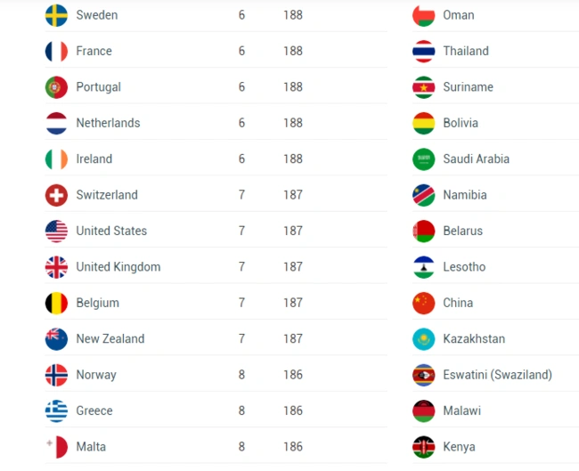 Στην 6η θέση είναι η Γαλλία, η Ιρλανδία, η Ολλανδία, η Πορτογαλία και η Σουηδία (188 προορισμοί χωρίς Visa) ενώ στη συνέχεια συναντάμε το Βέλγιο, τη Νέα Ζηλανδία, την Ελβετία, το Ηνωμένο Βασίλειο και τις Ηνωμένες Πολιτείες (καλύπτουν 187 προορισμούς).