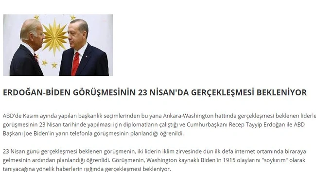 Σύμφωνα με δημοσίευμα του τουρκικού πρακτορείου ειδήσεων ΑΝΚΑ, ο Τούρκος πρόεδρος Ρετζέπ Ταγίπ Ερντογάν αναμένεται να έχει σήμερα, Παρασκευή 23 Απριλίου, τηλεφωνική επικοινωνία με τον Αμερικανό ομόλογό, Τζο Μπάιντεν.