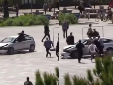 Στις εικόνες που κάνουν το γύρο του διαδικτύου διακρίνονται περαστικοί να προσπαθούν να ανακόψουν την πορεία του ΙΧ, καθώς έκανε κύκλους με την όπισθεν, τραβώντας έξω τον οδηγό από την ανοικτή πόρτα.