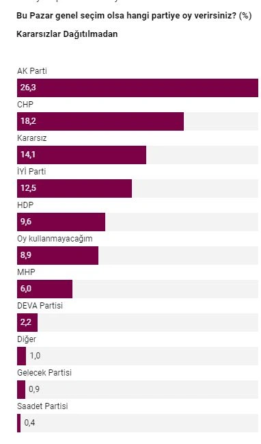 Το AKP, σημειώνει σημαντική μεταβολή χωρίς το ποσοστό των αναποφάσιστων αφού τότε, συγκεντρώνει το 33,9%, ενώ από την άλλη το ποσοστό του MHP, παραμένει χαμηλό με 8,6%. Πάντως εκ νέου το ποσοστό παραμένει χαμηλό για την ύπαρξη αυτοδύναμης κυβέρνησης. Μικρή είναι η άνοδος του CHP, αφού στη συγκεκριμένη μέτρηση σημειώνει άνοδο άνω των 4 μονάδων και το ποσοστό φτάνει το 22,5%. Τέλος μικρή άνοδο σημειώνουν το Κάλο Κόμμα και το HDP, με τα ποσοστά τους στη συγκεκριμένη μέτρηση να γίνονται 15,8% και 11,9% αντίστοιχα.
