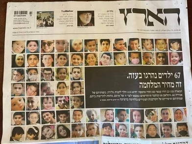 Γροθιά στο στομάχι είναι το πρωτοσέλιδο της ισραηλινής εφημερίδας Haaretz την Πέμπτη, καθώς καλύπτεται με 67 τα πρόσωπα Παλαιστινίων παιδιών και εφήβων που έχασαν τη ζωή τους στη Λωρίδα της Γάζας από τους βομβαρδισμούς του Ισραήλ, κατά την πρόσφατη κλιμάκωση της βίας ανάμεσα σε Ισραηλινούς και Παλαιστίνιους.