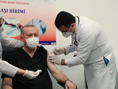 Ο Ερντογάν έκανε την πρώτη δόση του εμβολίου στις 14 Ιανουαρίου και τη δεύτερη στις 11 Φεβρουαρίου, αλλά παραμένει άγνωστο πότε έκανε την τρίτη δόση.