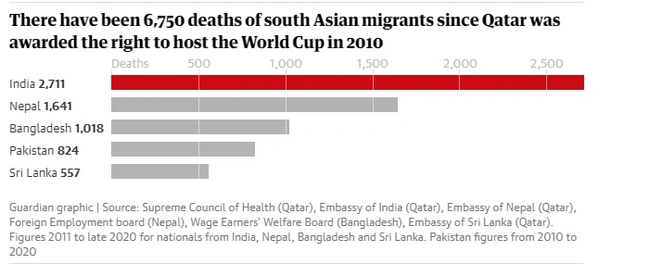 Σοκαριστικά είναι τα στοιχεία που αποκαλύπτονται στο ρεπορτάζ του Guardian αναφορικά με τους μετανάστες που έχουν χάσει τη ζωή τους στα έργα για το Μουντιάλ του 2022 που θα πραγματοποιηθεί στο Κατάρ. Για την ακρίβεια, πάνω από 6.500 άνθρωποι έχουν χάσει τη ζωή τους στα έργα που ξεκίνησαν το 2010. Οι πιο πολλοί από αυτούς ήταν από την Ινδία, ενώ σε αυτή τη μακάβρια λίστα ακολουθούν το Νεπάλ, το Μπαγκλαντές, το Πακιστάν και η Σρι Λάνκα.