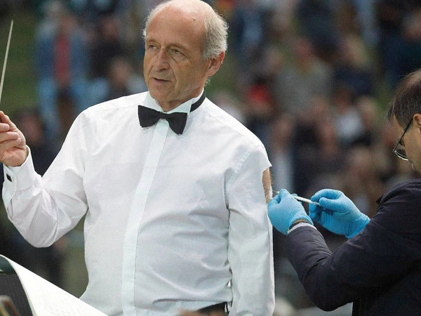 Ο Ιβάν Φίσερ διευθύνει την Ορχήστρα του Φεστιβάλ της Βουδαπέστης, ενώ ένας γιατρός του κάνει την τρίτη δόση του εμβολίου Covid-19, υπό το θερμό χειροκρότημα των θεατών. Η Ουγγαρία αποφάσισε να προχωρήσει με την Τρίτη δόση του εμβολίου καθώς εκφράζεται ανησυχία για νέο κύμα κρουσμάτων στην χώρα λόγω της μετάλλαξης Δέλτα.