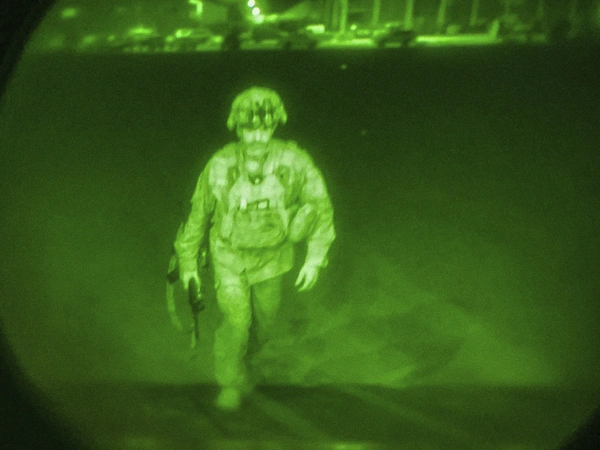 Το γύρο του κόσμου κάνει η φωτογραφία των αμερικανικών Ενόπλων Δυνάμεων με τον τελευταίο Αμερικανό αξιωματικό του αμερικανικού Στρατού να επιβιβάζεται στο μεταγωγικό αεροπλάνο όντας ο τελευταίος Αμερικανός που πατά το πόδι του σε αφγανικό έδαφος. Ο υποστράτηγος Κρις Ντόναχιου, διοικητής της 82ης αερομεταφερόμενης μεραρχίας, έχει αποθανατιστεί να επιβιβάζεται στην τελευταία πτήση που αναχώρησε, το βράδυ της Δευτέρας, από το διεθνές αεροδρόμιο Χαμίντ Καρζάι της Καμπούλ. Η φωτογραφία είναι τραβηγμένη μέσα από διόπτρα νυχτερινής όρασης.