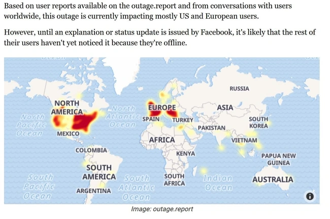 Σύμφωνα με αναφορές στα διεθνή ΜΜΕ, φαίνεται πως τα προσωπικά δεδομένα 1,5 δισ. χρηστών του Facebook είναι διαθέσιμα για πώληση σε γνωστό φόρουμ χάκερ, την ώρα που το δημοφιλές μέσο κοινωνικής δικτύωσης είναι εκτός λειτουργίας σε όλο τον κόσμο. Στα τέλη Σεπτεμβρίου, είχε δημοσιευτεί ανακοίνωση στο εν λόγω φόρουμ χάκερ που ανέφερε ότι είχε ονόματα, email, αριθμούς τηλεφώνου, τοποθεσία, φύλο 1,5 δισεκατομμυρίου χρηστών του Facebook.
