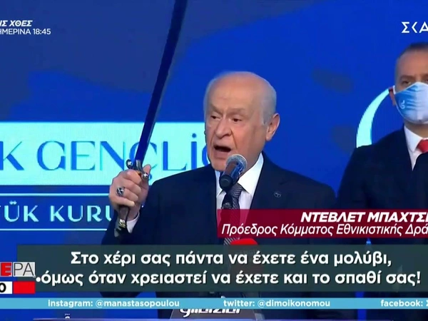 Αλλο ένα εθνικιστικό παραλήρημα του Ντεβλέτ Μπαχτσελί που μετατράπηκε σε τηλεοπτικό σόου κατέγραψαν οι τηλεοπτικές κάμερες των Μέσων Ενημέρωσης στην Τουρκία. Ο θιασώτης των «γκρίζων λύκων» και φανατικός υποστηρικτής της κυβέρνησης Ερντογάν εμφανίστηκε κραδαίνοντας γιαταγάνι! Ο ακροδεξιός πολιτικός έστειλε απειλητικό μήνυμα στις ΗΠΑ, που εξετάζουν να κατατάξουν τους εθνικιστές «γκρίζους λύκους» στη λίστα με τις τρομοκρατικές οργανώσεις. «Όμορφοι άνθρωποι του εθνικιστικού κινήματος, παιδιά μου. Στο χέρι σας πάντα να έχετε ένα μολύβι, όμως όταν χρειαστεί να έχετε και το σπαθί σας!» δήλωσε χαρακτηριστικά ο ηγέτης του Κόμματος Εθνικιστικής Δράσης μιλώντας σε συνέδριο.