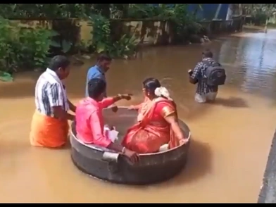 Ένα ζευγάρι από την Ινδία έφτασε στο γάμο του με έναν ασυνήθιστο τρόπο, αφού έπλευσε στους πλημμυρισμένους δρόμους της πόλης του, μέσα σε μια κατσαρόλα, μετά από τις έντονες βροχοπτώσεις που έφεραν τον όλεθρο στη νότια πολιτεία της Κεράλα.
