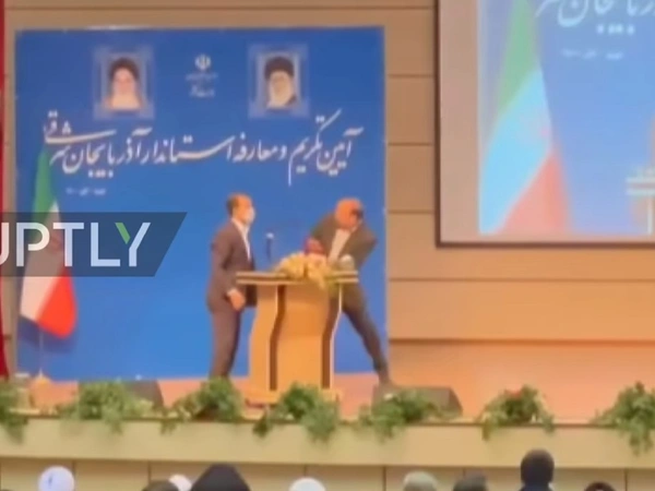 Τραγελαφικές καταστάσεις επικράτησαν σε πολιτική ομιλία στο Ιράν! Στη διάρκεια της παρουσίασης του νέου πλάνου διακυβέρνησης, από τον κυβερνήτη Αμπεντίν Κοράμ, ένας άνδρας, ανέβηκε στο βήμα, τον πλησίασε και τον χαστούκισε! Την ώρα που το «θύμα» ήταν στο βήμα και μιλούσε στο κοινό, χωρίς να προηγηθεί καμία κουβέντα, ο άνδρας που φέρεται να είναι πολιτικός και πρώην στρατιωτικός, χαστούκισε τον κυβερνήτη στο πρόσωπο και στη συνέχεια τον έσπρωξε, μέχρι να τον «μαζέψει» η ασφάλεια.