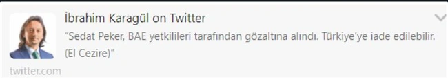Σύμφωνα με όσα μεταδίδονται, τα ΗΑΕ θα ήταν αυτά που θα έστελναν τον Τούρκο αρχιμαφιόζο στις τουρκικές αρχές. Μάλιστα τα περί έκδοσης του Πεκέρ, ανήρτησε σε tweet και ο γνωστός φανατικά ερντογανικός δημοσιογράφος Ιμπραΐμ Καραγκιούλ, ο οποίος λίγο αργότερα διέγραψε την ανάρτηση.