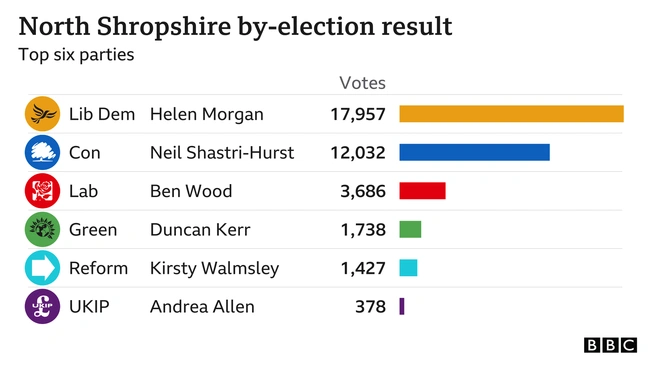 Η υποψήφια των Φιλελεύθερων Δημοκρατών, η Χέλεν Μόργκαν, επιβλήθηκε με διαφορά σχεδόν 6.000 ψήφων του υποψηφίου των Τόρις στη διαδικασία αυτή, που οργανώθηκε μετά την παραίτηση του βουλευτή των Συντηρητικών Όουεν Πάτερσον, κατηγορούμενου για lobbying έναντι αμοιβής. Οι Τόρις είχαν κερδίσει τη συγκεκριμένη έδρα, στην περιοχή Βόρειο Σρόψιρ, με διαφορά 23.000 ψήφων το 2019. Έτσι, οι Συντηρητικοί στη Βρετανία έχασαν την έδρα του North Shropshire που κατείχαν για σχεδόν 200 χρόνια.