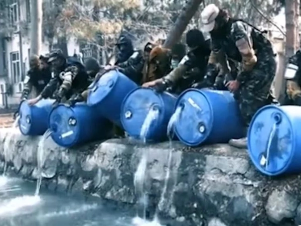 Σε βίντεο που δόθηκε στη δημοσιότητα από τη Γενική Διεύθυνση Πληροφοριών (ΓΔΠ), ένστολοι των ειδικών υπηρεσιών του Ισλαμικού Εμιράτου του Αφγανιστάν (ΙΕΑ, έτσι αποκαλούν οι Ταλιμπάν το καθεστώς τους), εικονίζονται καθώς αδειάζουν μεγάλα βαρέλια στο κανάλι.