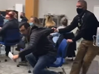 Ο φύλακας τότε τον πλησίασε και προσπάθησε να τον απομακρύνει βίαια από την θέση του, σπρώχνοντάς τον μαζί με την καρέκλα του. Με τη βοήθεια ενός άλλου προσπάθησαν μάλιστα να τον πετάξουν... σηκωτό από το συμβούλιο, διότι πήγαινε κόντρα στα μέτρα προστασίας. Μια γυναίκα άρχισε να απαθανατίζει το συμβάν και το δημοσίευσε στο βίντεο. «Αυτό είναι επίθεση», αρχίζει να φωνάζει εκείνη. «Τα ίδια κάνετε και στα παιδιά μας;» ρωτά μια άλλη.