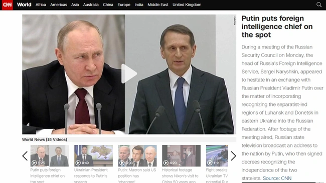 Κορυφαία διεθνή ειδησεογραφικά πρακτορεία προσέγγισαν το γεγονός ακόμη και με χιούμορ προσπαθώντας να μπουν στα... παπούτσια του Ρώσου Αρχηγού Εξωτερικών Πληροφοριών Ναρίσκιν στο Συμβούλιο Ασφαλείας, με άλλα να γράφουν για «ξεφτίλα», αλλά για «ρεζίλεμα», όταν εκείνος έχασε τα λόγια του και προσπάθησε να συνταχθεί με όσα του όριζε ο Πούτιν.